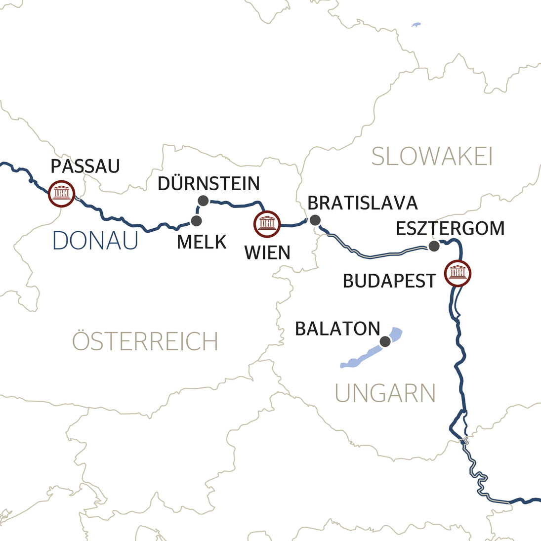 Die Donau, Europas zweitlängster Fluss beeindruckt mit einzigartigen Naturlandschaften, geschichtsträchtigen Städte und einer kulturellen Vielfalt. Start und Ziel ist die Drei-Flüsse-Stadt Passau, von wo aus Ihre Kreuzfahrt durch beeindruckende Städte führt. Erleben Sie das prachtvolle Wien, die slowakische Hauptstadt Bratislava, Budapest und Esztergom, die ehemalige ungarische Königsstadt. Nach einem Abstecher zum Balaton, geht es durch die weinselige Wachau ins malerische Dürnstein und die Besichtigung des berühmten Barockstifts in Melk bildet den Abschluss dieser unvergesslichen Reise.