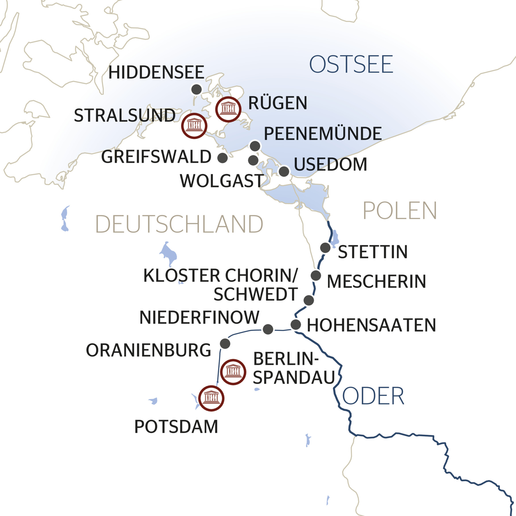 Stralsund - Vitte (Hiddensee) - Putbus-Lauterbach - Peenemünde - Wolgast - Szczecin - Mescherin - Schwedt / Oder - Lehnitz - Hennigsdorf - Berlin-Spandau - Potsdam
