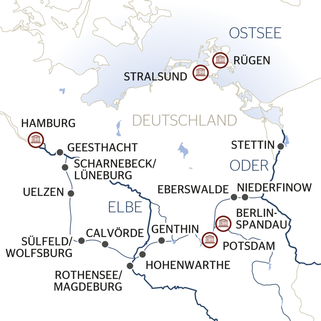 Der hohe Norden zwischen Ostsee, Peene, Oder, Havel und Elbe begeistert mit eindrucksvollen Landschaften und einem reichen kulturellen Erbe. Von den markanten Kreidefelsen auf Rügen, der einzigartigen Boddenküste, den weitläufigen Wäldern nördlich von Berlin zum malerischen Havelland und dazwischen die traditionsreichen Städte Hamburg, Lüneburg, Magdeburg, Berlin und Stettin. Erleben Sie auf diese Kreuzfahrt voller Natur, Kultur und Geschichte.