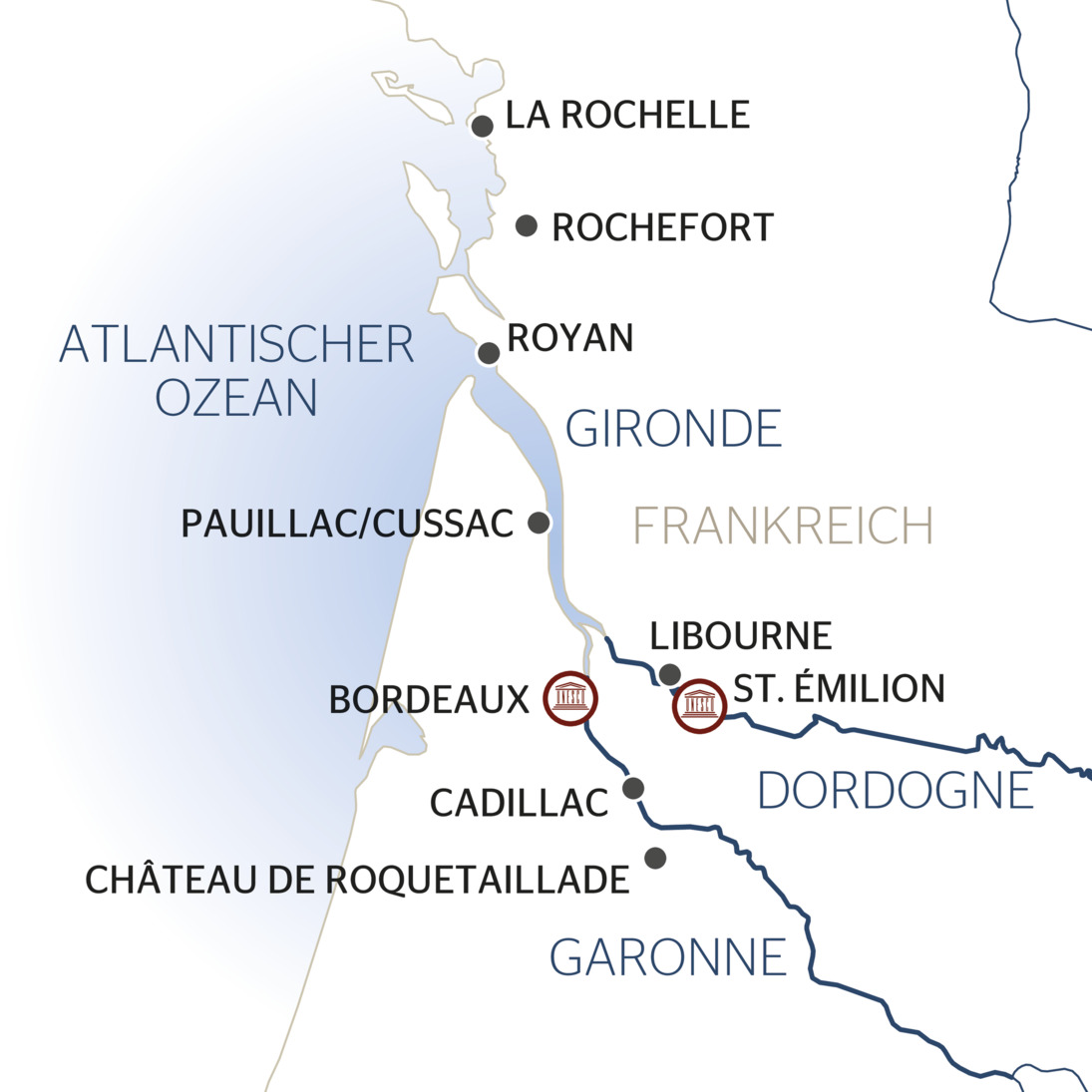 Nach dem Frühstück starten Sie mit dem Bus zu einer Stadtbesichtigung von Bordeaux. Die Stadt beeindruckt vor allem mit seinen prachtvollen klassizistischen Bauten, die im 18. Jahrhundert die Fachwerkhäuser verdrängten und ihr den Titel des Weltkulturerbes einbrachten. Ein absolutes Meisterwerk der Gotik ist die majestätische Kathedrale St-André mit ihrer filigranen Spitzenarchitektur. Zum Mittagessen kehren Sie zurück an Bord. Nachmittags haben Sie die Gelegenheit, um Bordeaux auf eigene Faust zu erkunden. Schlendern Sie durch über die großzügig gestalteten Plätze der Innenstadt, entdecken Sie die charmanten Fußgängerzonen oder besuchen Sie eines der Museen. Abendessen an Bord.