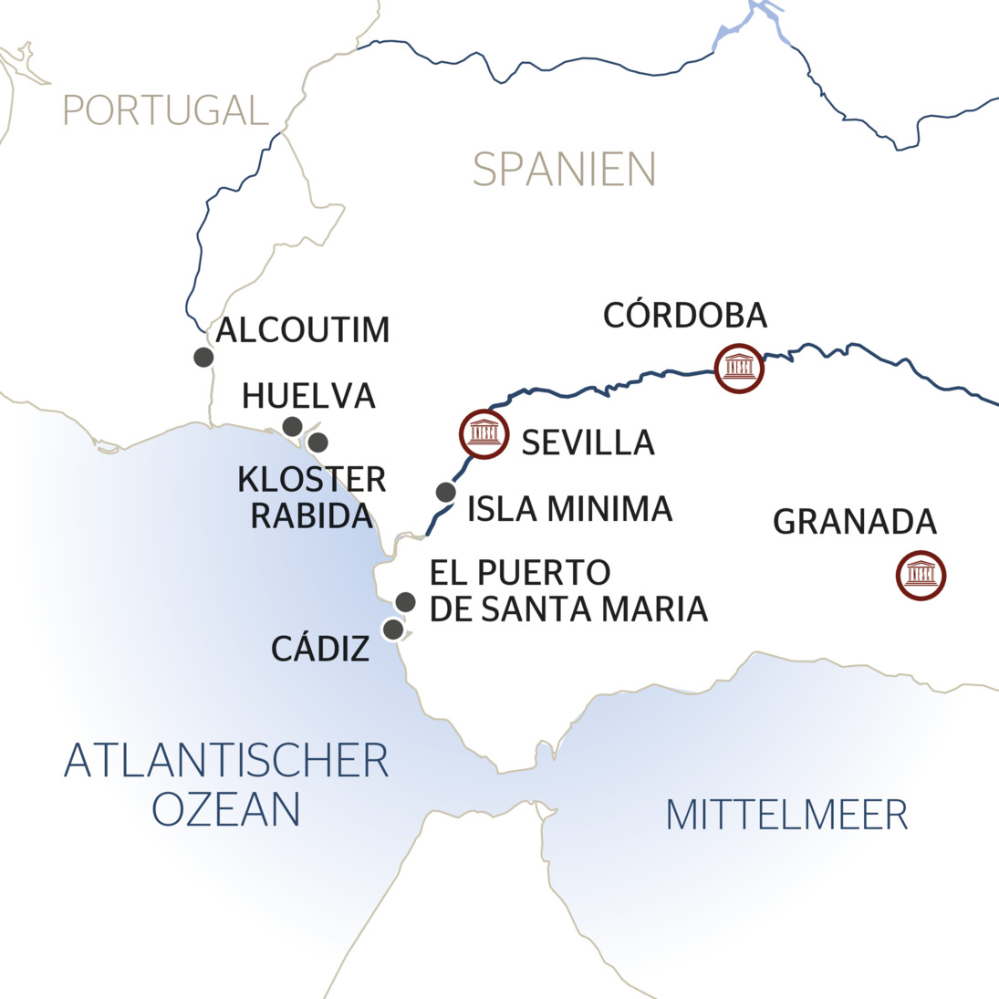 Eine einzigartige Kreuzfahrt in Südspanien auf dem Guadalquivir führt Sie zu den Spuren der Mauren. Erleben Sie diese Kombination aus der maurischen Kultur und der Mystik des Orients. Prachtvolle Kirchen, Kathedralen und Schätze, wie die Alhambra in Granada spiegeln den Glanz der Vergangenheit wider.