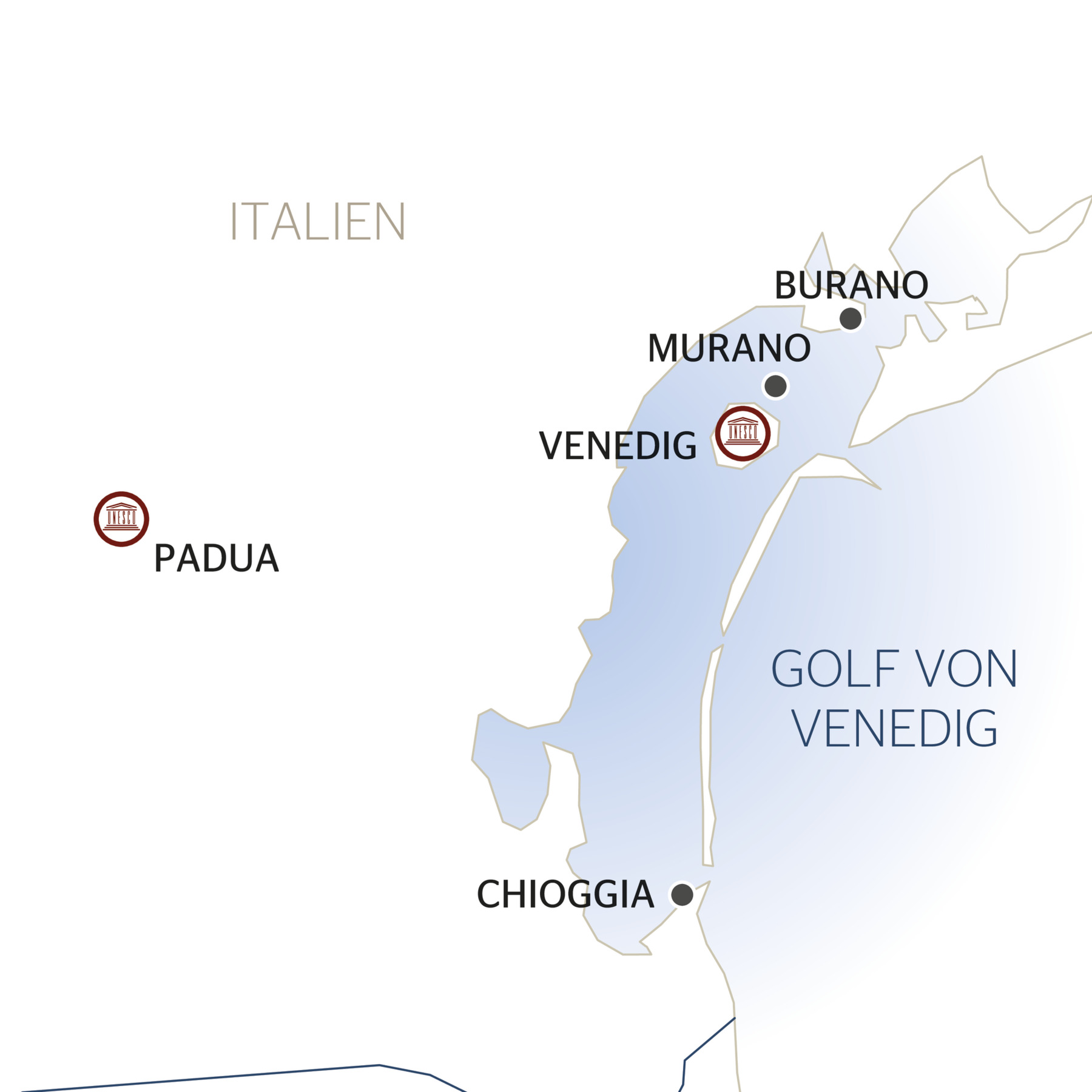Erleben Sie an Bord der MS Michelangelo die malerische Stadt Venedig und ihre Lagune. Entdecken Sie die Schönheit der weltbekannten Dogenstadt, die Insel Burano mit ihren farbenfrohen Häusern und die Insel MUrano, die berühmt für ihre Glasbläsereien ist. Durch die Lagune bringt Ihr Hotelschiff Sie nach Chioggia, einem malerischen Fischerstädtchen, und von dort geht es zur historischen Universitätsstadt Padua.
