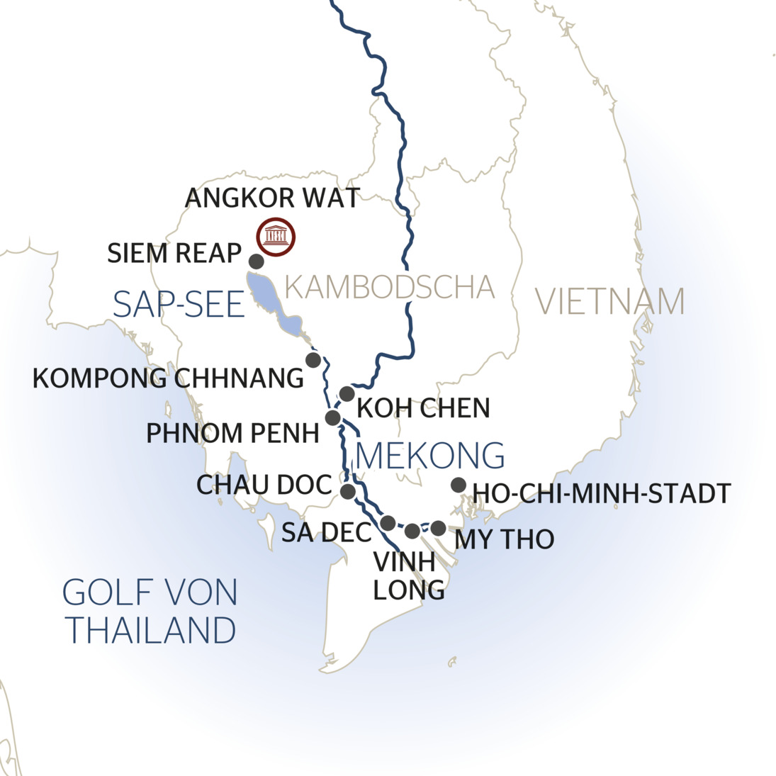 Die Flusskreuzfahrten auf dem Mekong durch Vietnam und Kambodscha führen Sie auf den Spuren uralter Traditionen und ist die wohl eindrucksvollste Art, Südostasien zu entdecken. Von den monumentalen Prachtbauten des alten Khmer-Reiches bis zum Besuch von Angkor Wat – lassen Sie sich von der exotischen und außergewöhnlichen Atmosphäre verzaubern. Erleben Sie eine unvergessliche und inspirierende Reise und sehen Sie u.a. schwimmende Märkte, traditionelle Dörfer, die natürliche Schönheit der Ha Long Bucht oder heilige Tempel und traditionelle Tänze der Khmer.