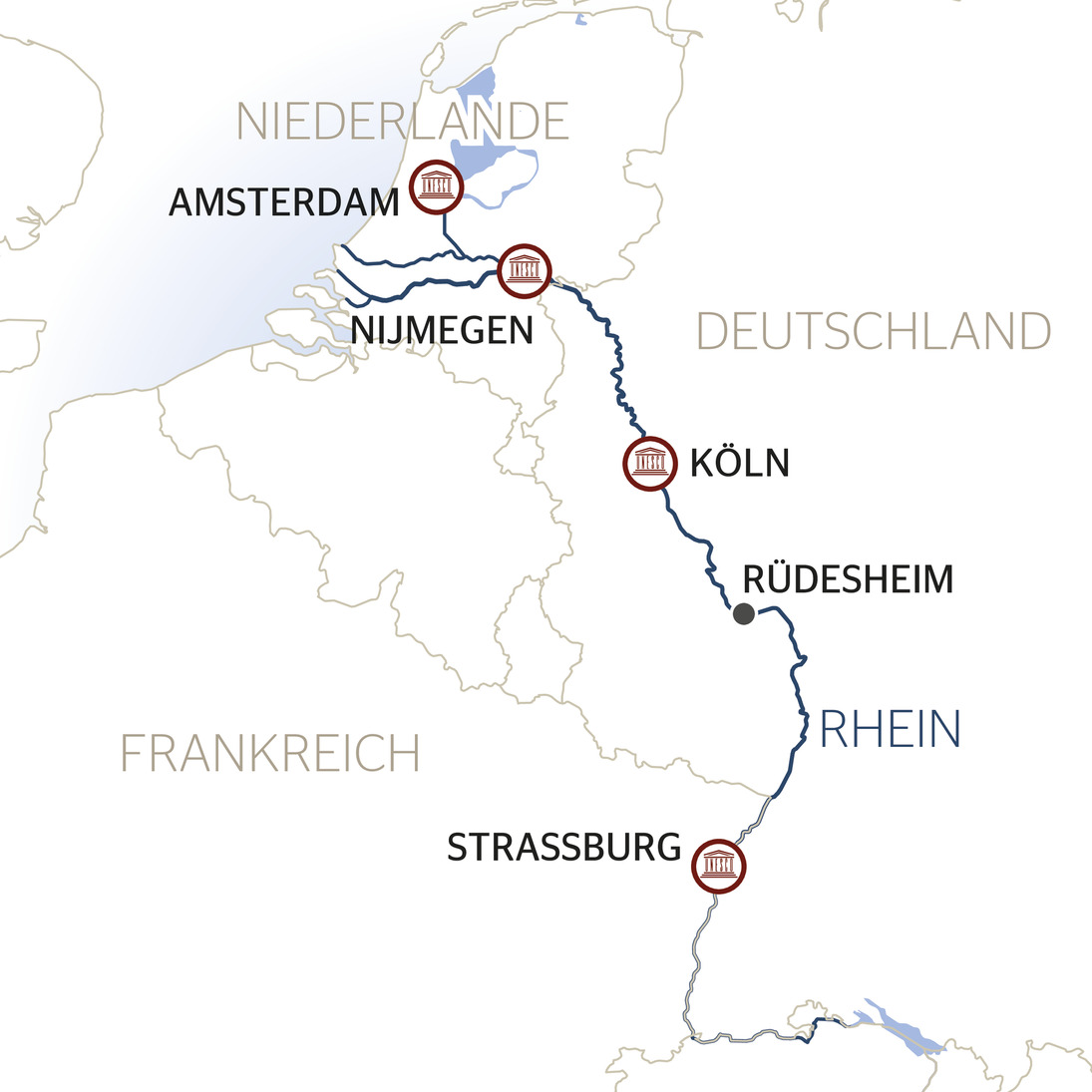 Erleben Sie eine unvergessliche Kreuzfahrt entlang des malerischen Rheins. Eine Reise durch faszinierende Landschaften und entlang charmanter Städte erwarten Sie. Freuen Sie sich auf das romantische Rüdesheim, bummeln Sie durch Köln und Nijmegen und erleben Sie zum krönenden Abschluss das bezaubernde Amsterdam – das „Venedig des Nordens“.