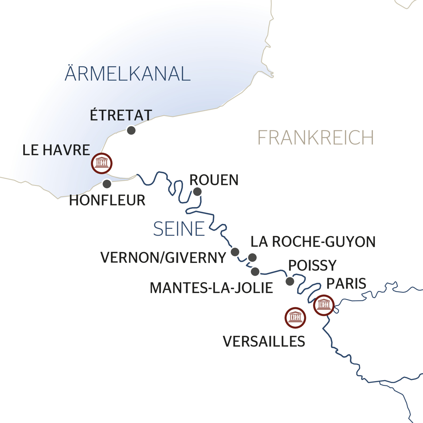 Erleben Sie eine unvergesslich schöne Kreuzfahrt, deren Eindrücke abwechslungsreicher kaum sein können: die Metropole Paris, die prachtvollen Gärten von Versailles, das mittelalterliche Flair von Rouen, die malerische Küstenlandschaften und die sattgrüne Landschaften der Normandie. An Bord der MS Renoir wird Ihre Reise zu einem wahren Luxus-Erlebnis.