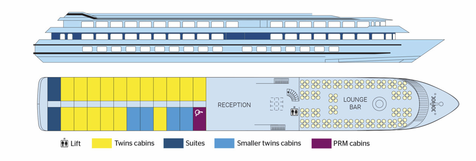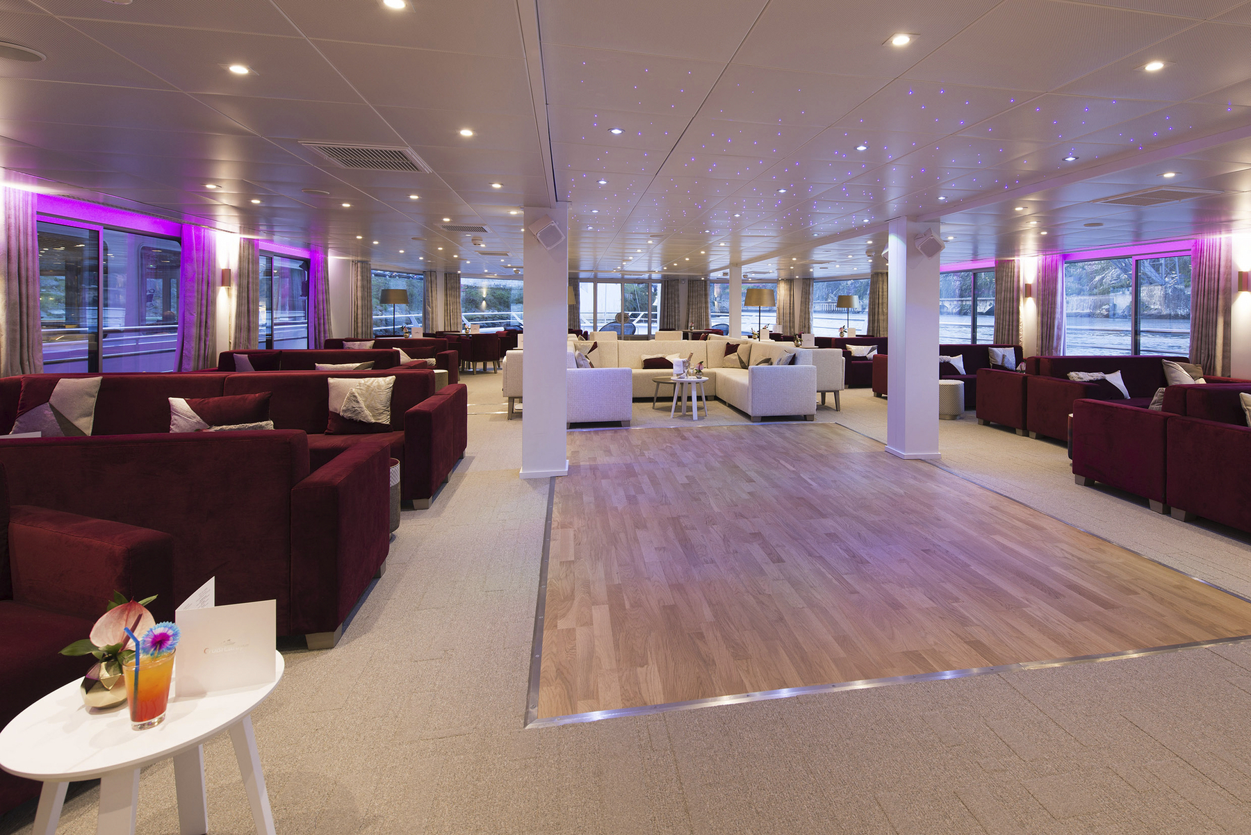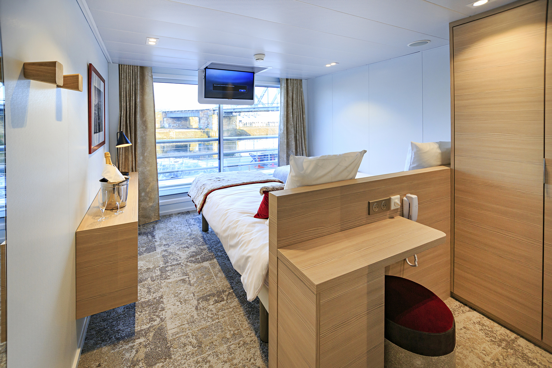Das Interieur der MS Miguel Torga stellt die berühmten Weine und die Architektur Portos in den Mittelpunkt. Die Kombination aus bordeauxroter Farbe, hellem Holz und schwarzen Stahlelemente erinnert an den Portwein und seine Weinfässer. Das 2017 gebaute Schiff der 5-Anker-Kategorie bietet viel Platz auf den 3 weitläufigen Decks, die mit einem Lift verbunden sind. Die Kabinen sind zwischen 11 und 14 qm groß und verfügen über große Panoramafenster, die während der Fahrt einen herrlichen Blick auf die Landschaft bieten. Auf dem Ober- und Mitteldeck befinden sich vier Suiten. Zwei davon verfügen über eine eigene Terrasse mit Liegestühlen. Alle Mahlzeiten während der Kreuzfahrt werden im Restaurant auf dem Hauptdeck serviert. Auf dem Mitteldeck sind der Salon und die Bar im vorderen Teil des Schiffes, wo sich auch eine Terrasse befindet. Das Sonnendeck ist mit einem Swimmingpool und Liegestühlen ausgestattet.