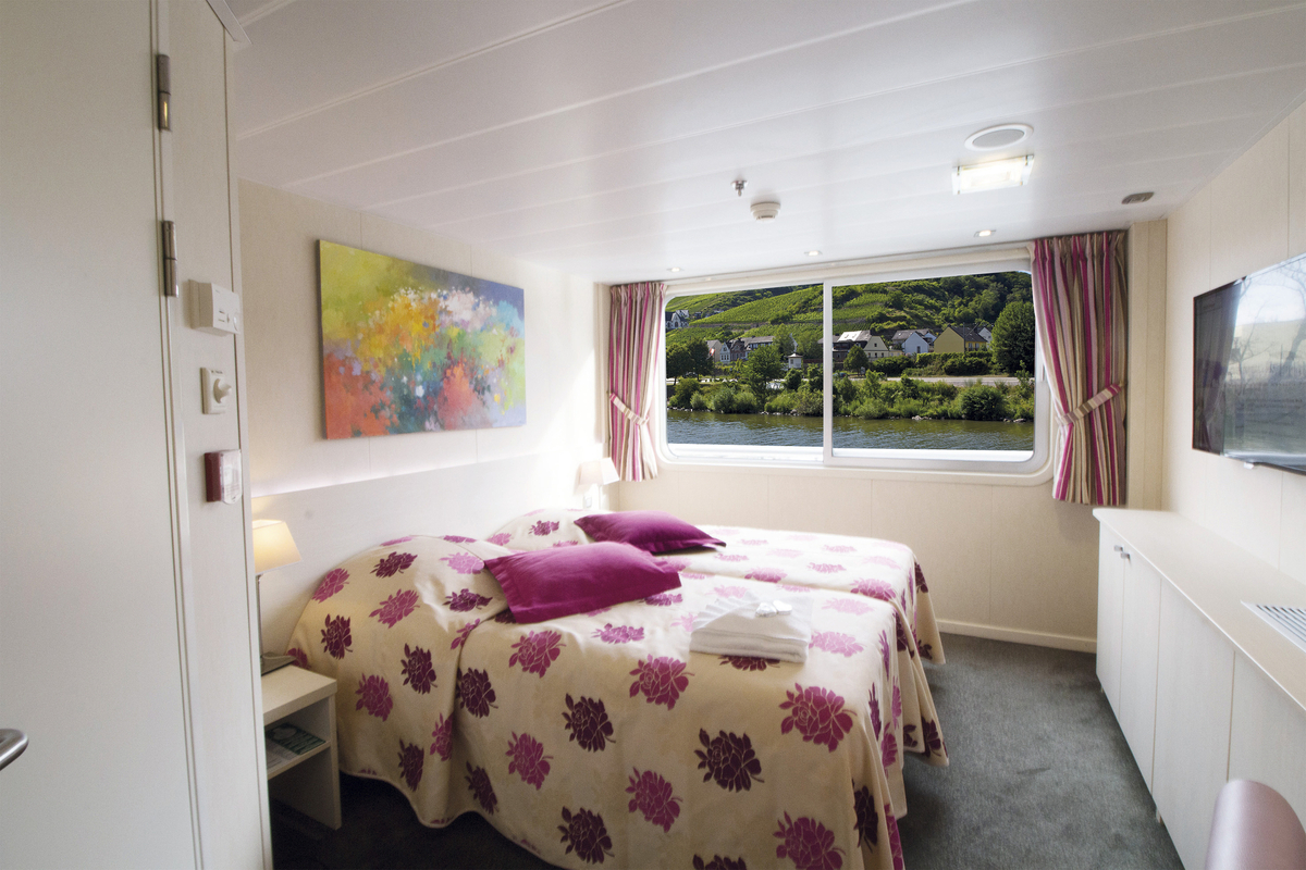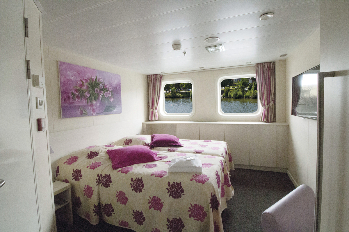 212483©CroisiEurope Zweibettkabine Mitteldeck Die Zweibettkabinen auf dem Mitteldeck verfügen über grosse Fenster mit Schiebemechanismus.Die Kabinen verfügen des Weiteren über:TVTelefon (nur interne Anrufe)Bad mit Dusche und WCHandtücherSafeKlimaanlage (unabhängig regulierbar)Elektrizität mit 220 VWi-Fi
